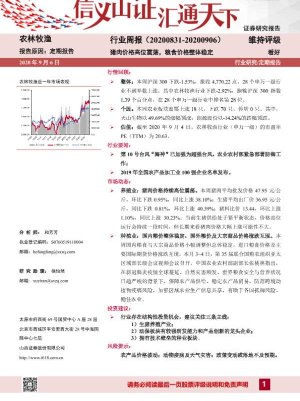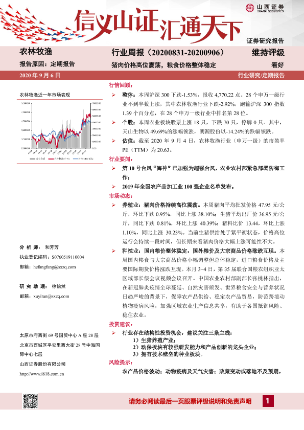 【山西证券】【20200906】20200906-山西证券-农林牧渔行业周报:猪肉价格高位震荡,粮食价格整体稳定-14页