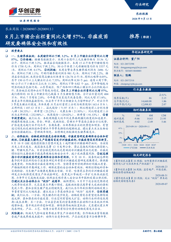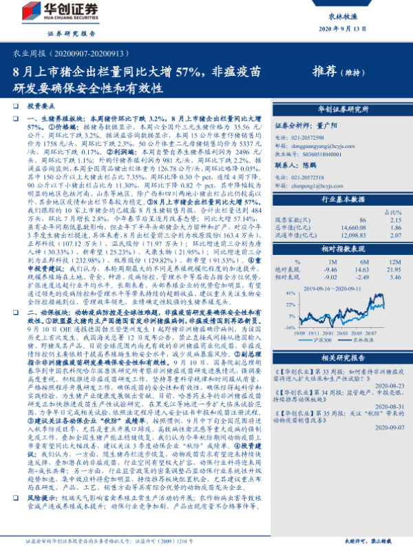 【华创证券】【20200913】20200913-华创证券-农业周报:8月上市猪企出栏量同比大增57%,非瘟疫苗研发要确保安全性和有效性-29页