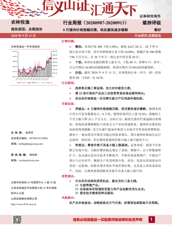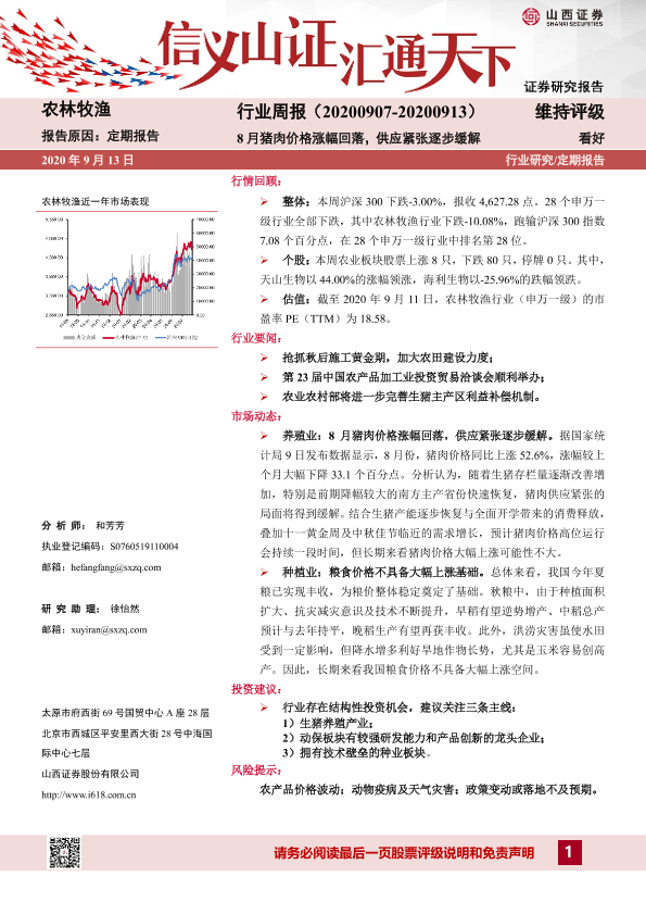 【山西证券】【20200913】20200913-山西证券-农林牧渔行业周报:8月猪肉价格涨幅回落,供应紧张逐步缓解-14页