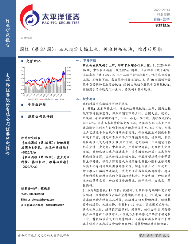 【太平洋证券】【20200913】20200913-太平洋-农林牧渔周报(第37周):玉米期价大幅上涨,关注种植板块,推荐后周期-16页