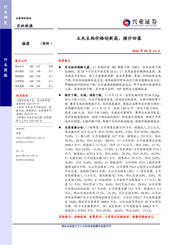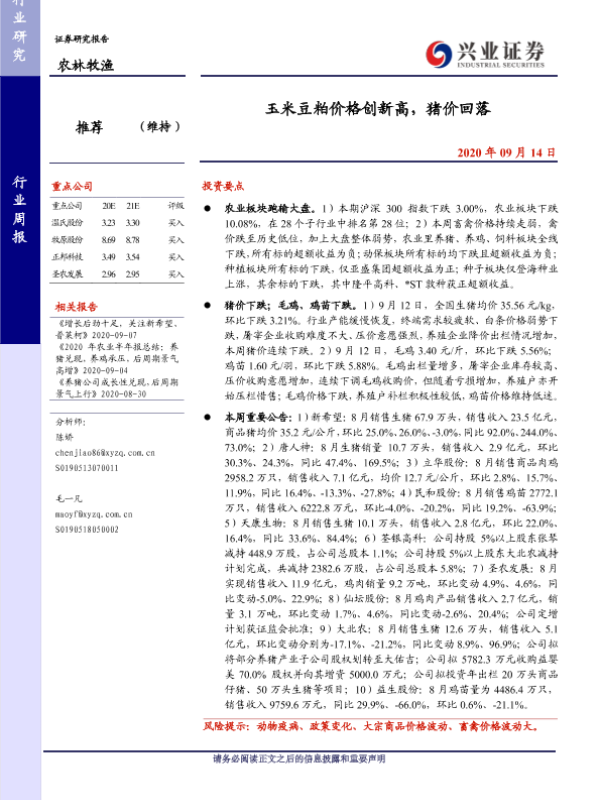 【兴业证券】【20200914】20200914-兴业证券-农林牧渔行业周报:玉米豆粕价格创新高,猪价回落-15页