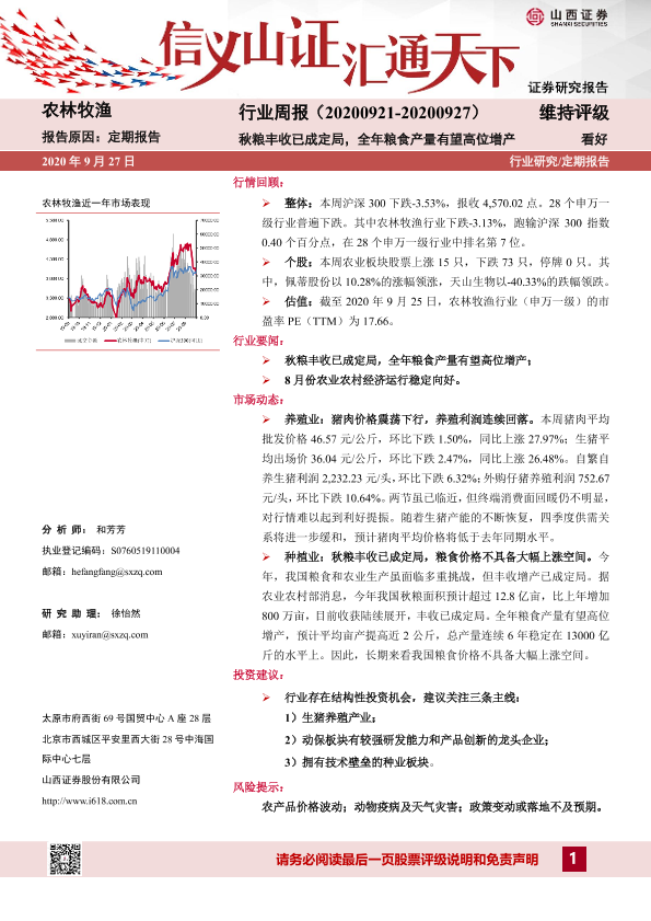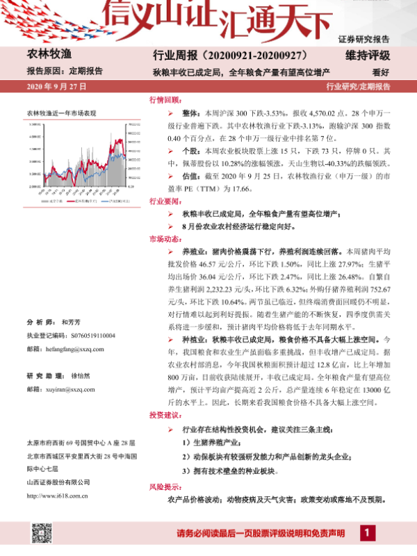 【山西证券】【20200927】20200927-山西证券-农林牧渔行业周报:秋粮丰收已成定局,全年粮食产量有望高位增产-13页