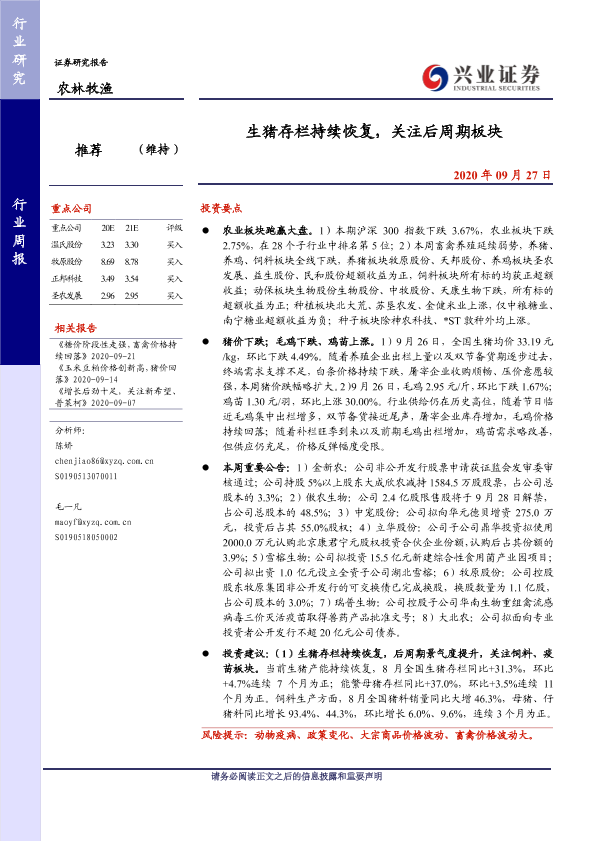 【兴业证券】【20200927】20200927-兴业证券-农林牧渔行业周报:生猪存栏持续恢复,关注后周期板块-15页
