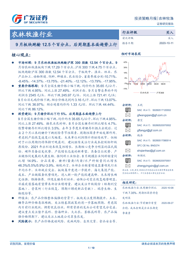 【广发证券】【20201011】20201011-广发证券-农林牧渔行业投资策略月报:9月板块跑输12.5个百分点,后周期基本面趋势上行-19页