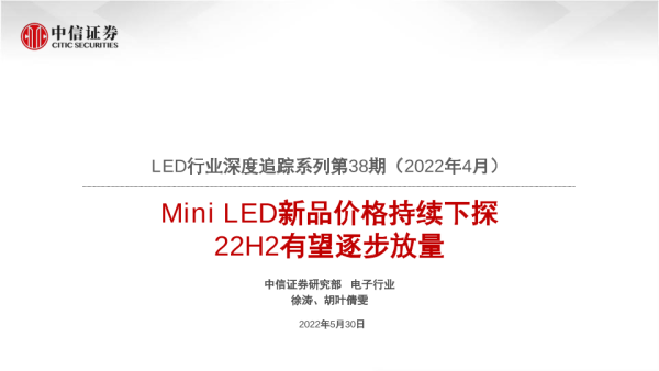 【中信证券】【20220530】LED行业深度追踪系列第38期(2022年4月):Mini LED新品价格持续下探,22H2有望逐步放量-20页