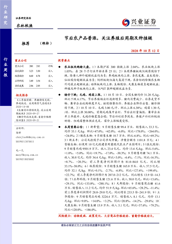 【兴业证券】【20201012】20201012-兴业证券-农林牧渔行业周报:节后农产品普涨,关注养殖后周期及种植链-15页