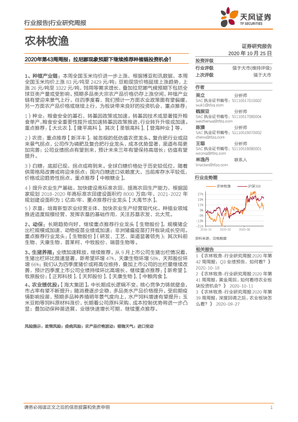 【天风证券】【20201025】20201025-天风证券-农林牧渔2020年第43周周报:拉尼娜现象预期下继续推荐种植链投资机会!-15页