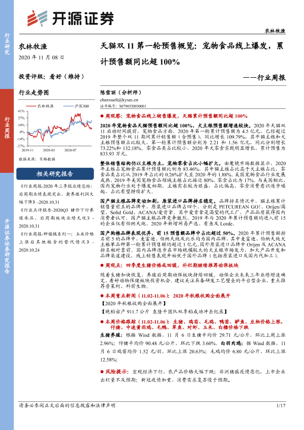 【开源证券】【20201108】农林牧渔行业周报:天猫双11第一轮预售概览:宠物食品线上爆发,累计预售额同比超100%-17页