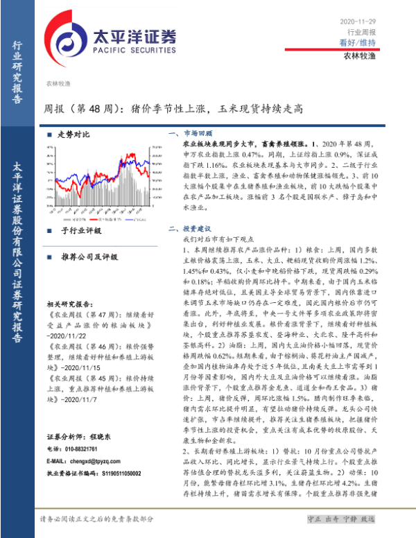 【太平洋证券】【20201129】20201129-太平洋-农林牧渔周报(第48周):猪价季节性上涨,玉米现货持续走高-15页