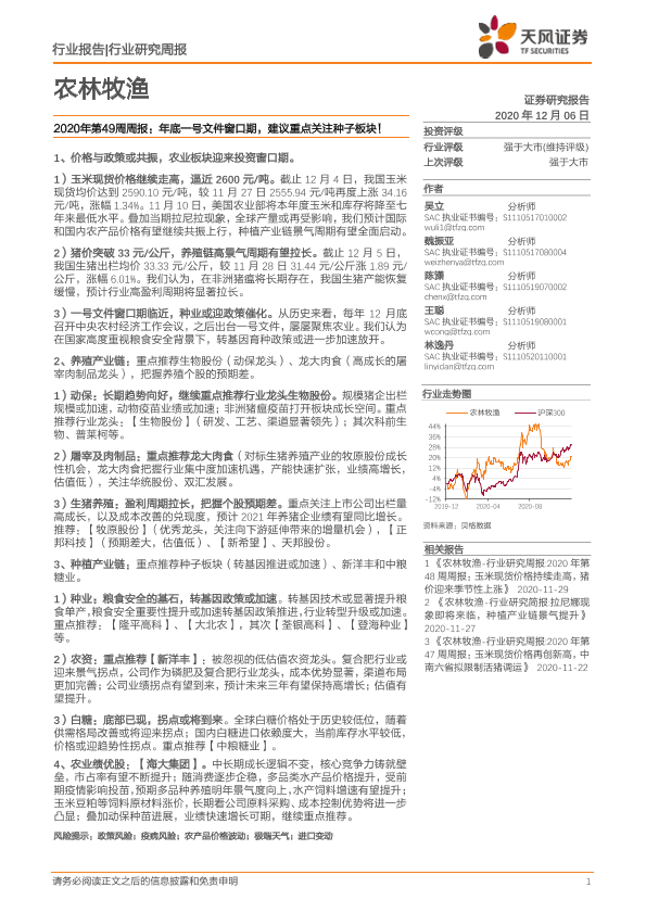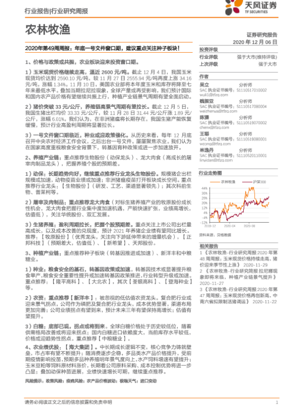 【天风证券】【20201206】农林牧渔2020年第49周周报:年底一号文件窗口期,建议重点关注种子板块!-15页