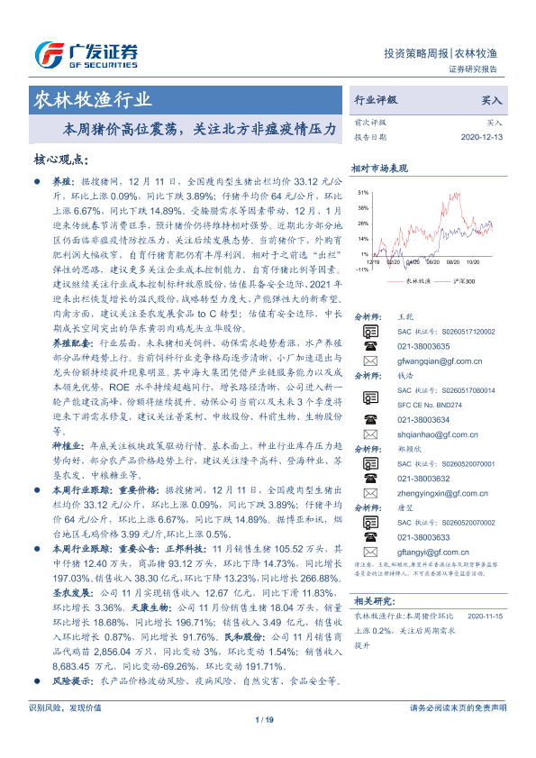 【广发证券】【20201213】20201213-广发证券-农林牧渔行业投资策略周报:本周猪价高位震荡,关注北方非瘟疫情压力-19页