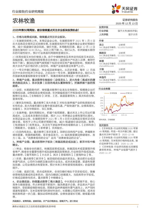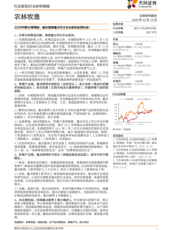 【天风证券】【20201213】农林牧渔2020年第50周周报:建议继续重点关注农业板块投资机会!-15页