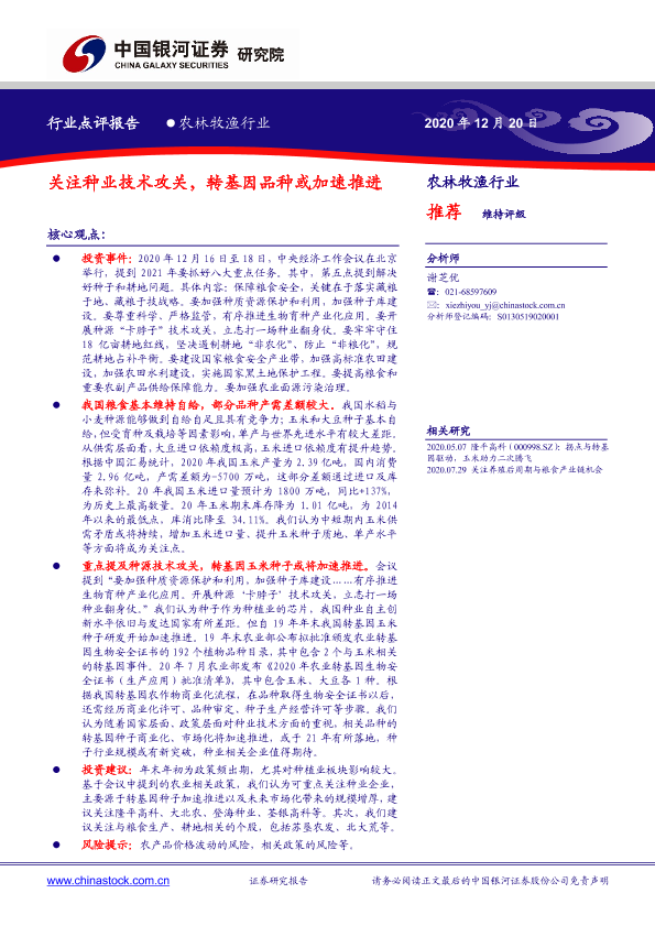 【银河证券】【20201220】农林牧渔行业:关注种业技术攻关,转基因品种或加速推进-2页
