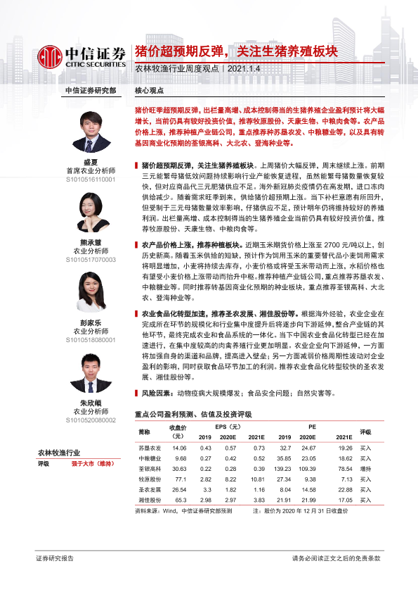 【中信证券】【20210104】20210104-中信证券-农林牧渔行业周度观点:猪价超预期反弹,关注生猪养殖板块-7页