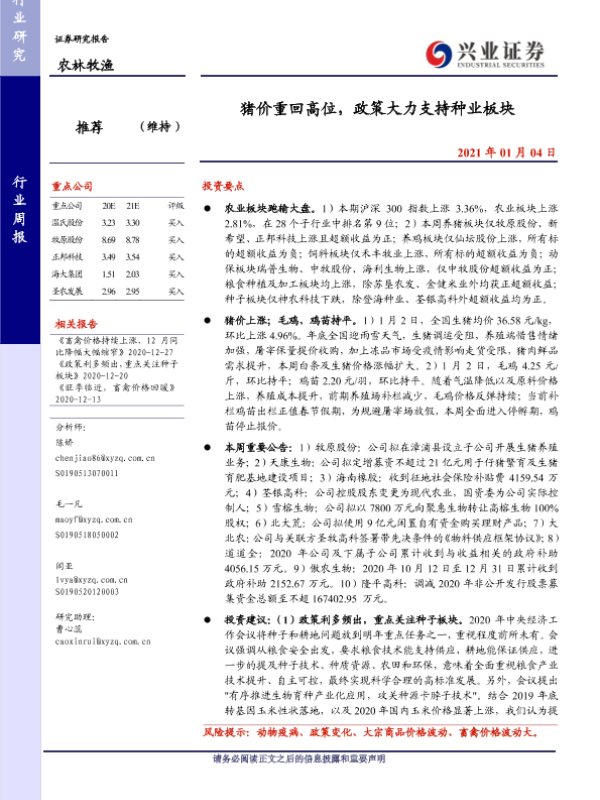 【兴业证券】【20210104】20210104-兴业证券-农林牧渔行业周报:猪价重回高位,政策大力支持种业板块-15页