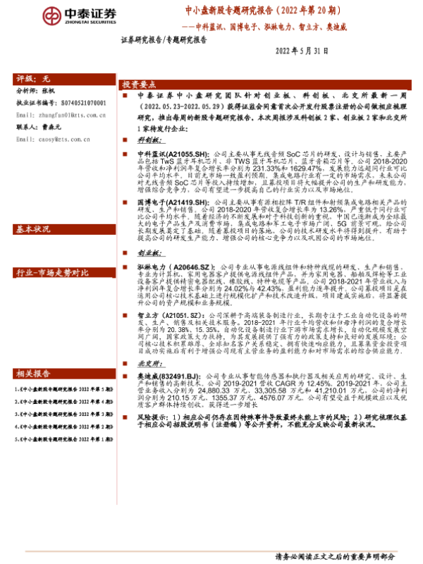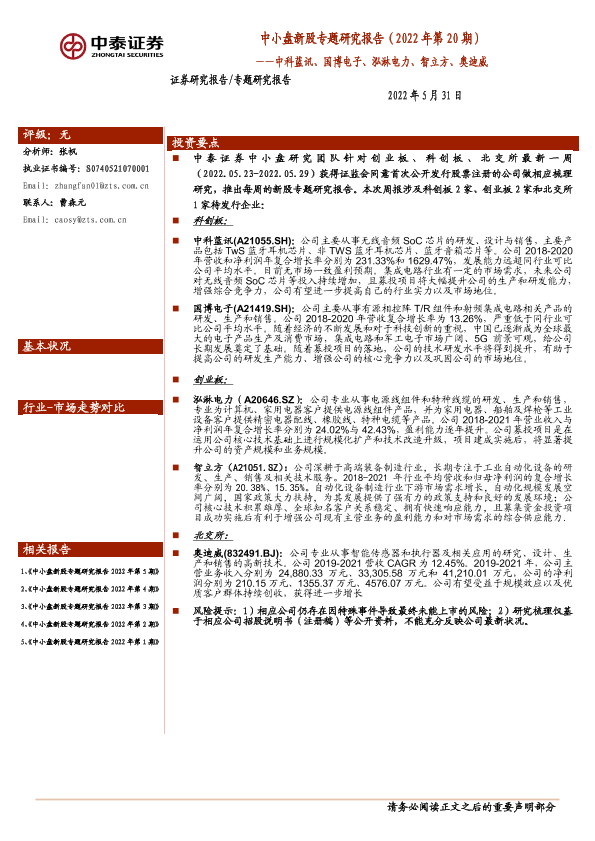 【中泰证券】【20220531】中小盘新股专题研究报告2022年第20期:中科蓝讯、国博电子、泓淋电力、智立方、奥迪威-28页