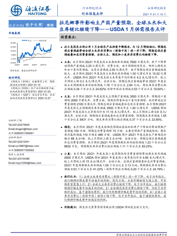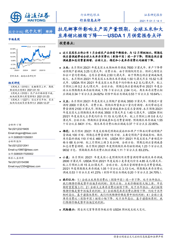 【海通证券】【20210114】农业:USDA1月供需报告点评-拉尼娜事件影响主产国产量预期,全球玉米和大豆库销比继续下降-6页