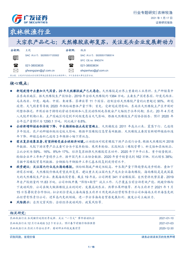 【广发证券】【20210117】农林牧渔行业:大宗农产品之七:天然橡胶底部复苏,关注龙头企业发展新动力-18页