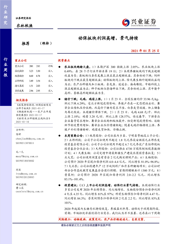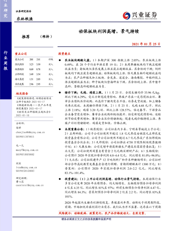 【兴业证券】【20210125】20210125-兴业证券-农林牧渔行业周报:动保板块利润高增,景气持续-15页