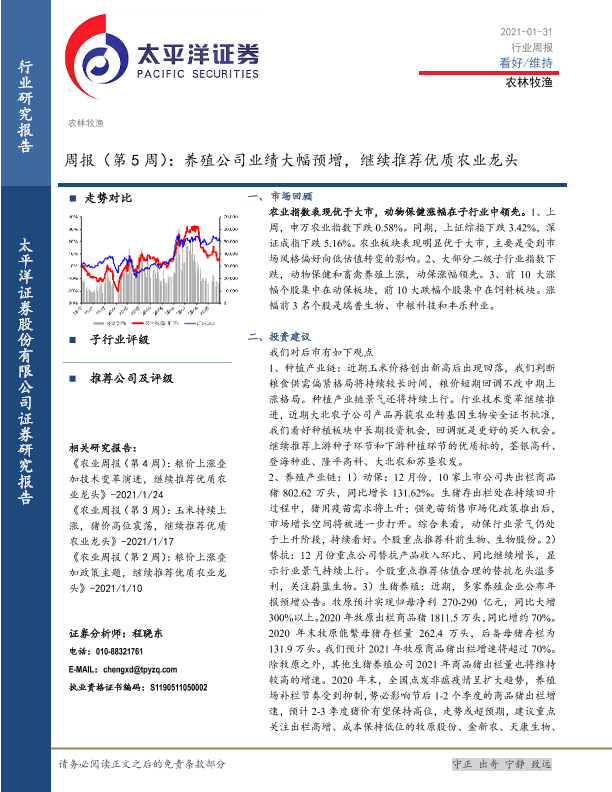 【太平洋证券】【20210131】20210131-太平洋-农林牧渔周报(第5周):养殖公司业绩大幅预增,继续推荐优质农业龙头-16页