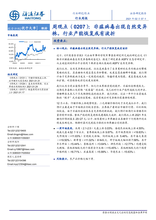 【海通证券】【20210207】农业周观点:非瘟病毒出现自然变异株,行业产能恢复或有波折-4页
