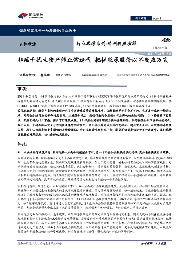 【国信证券】【20210217】农林牧渔行业思考系列-非洲猪瘟演绎:非瘟干扰生猪产能正常迭代 把握牧原股份以不变应万变-5页