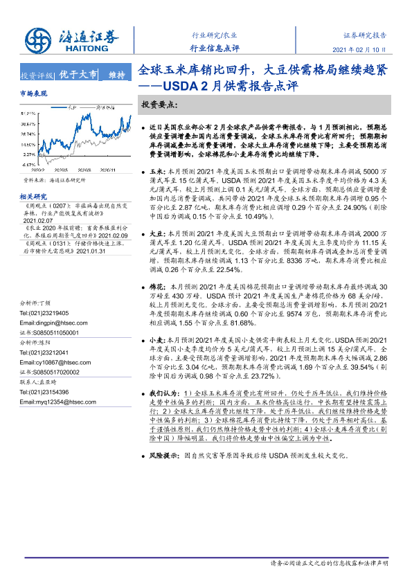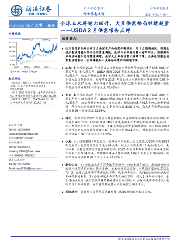 【海通证券】【20210210】农业行业信息点评:USDA2月供需报告点评-全球玉米库销比回升,大豆供需格局继续趋紧-6页