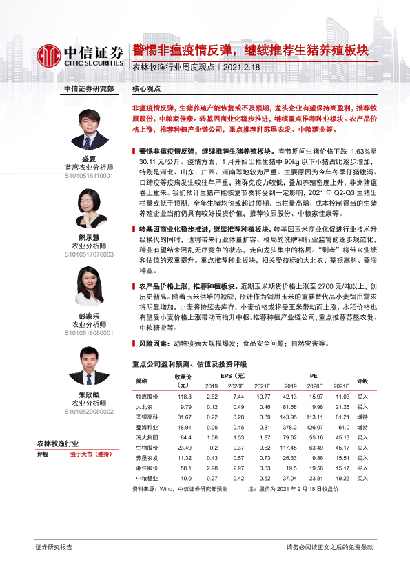 【中信证券】【20210218】20210218-中信证券-农林牧渔行业周度观点:警惕非瘟疫情反弹,继续推荐生猪养殖板块-8页
