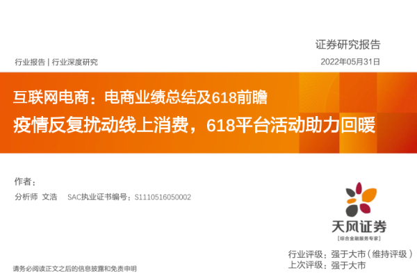 【天风证券】【20220531】互联网电商行业深度研究:电商业绩总结及618前瞻,疫情反复扰动线上消费,618平台活动助力回暖-23页