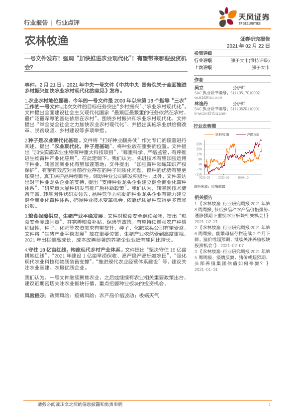 【天风证券】【20210222】20210222-天风证券-农林牧渔行业点评:一号文件发布!强调“加快推进农业现代化”!有望带来哪些投资机会?-2页