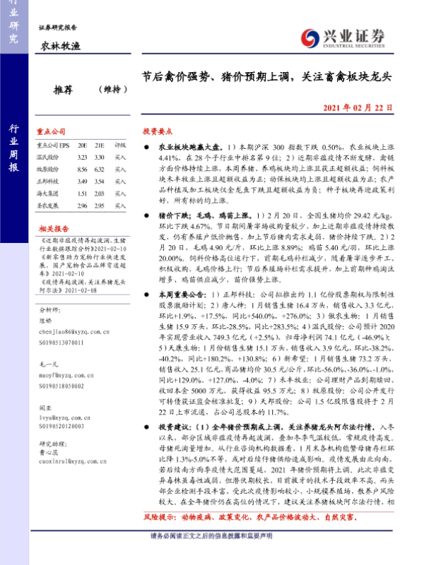 【兴业证券】【20210222】20210222-兴业证券-农林牧渔行业周报:节后禽价强势、猪价预期上调,关注畜禽板块龙头-15页