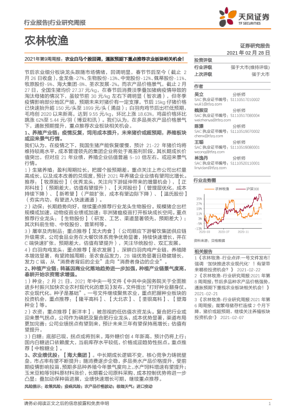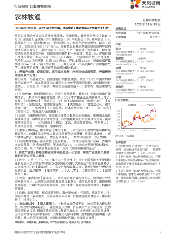 【天风证券】【20210228】农林牧渔2021年第9周周报:农业白马个股回调,通胀预期下重点推荐农业板块相关机会!-15页