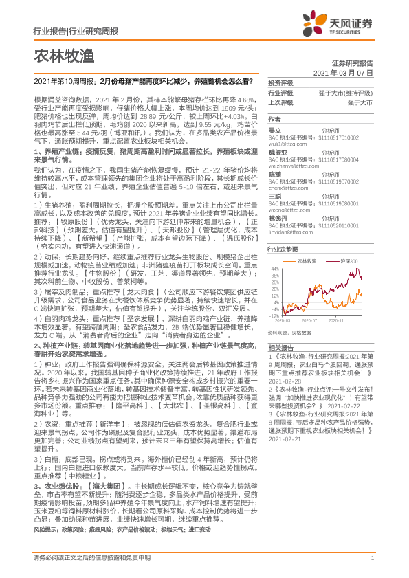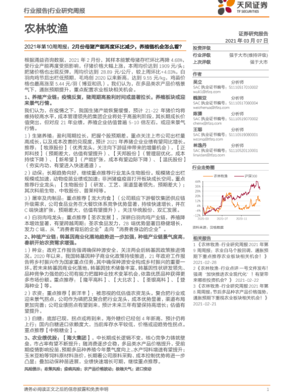 【天风证券】【20210307】农林牧渔2021年第10周周报:2月份母猪产能再度环比减少,养殖链机会怎么看?-15页