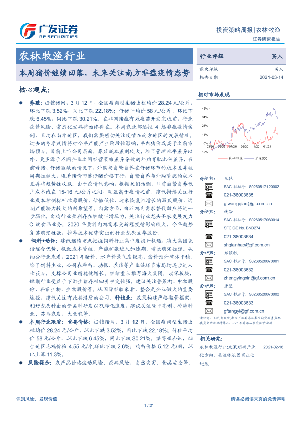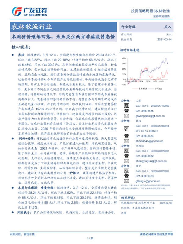 【广发证券】【20210314】20210314-广发证券-农林牧渔行业-本周猪价继续回落,未来关注南方非瘟疫情态势-21页