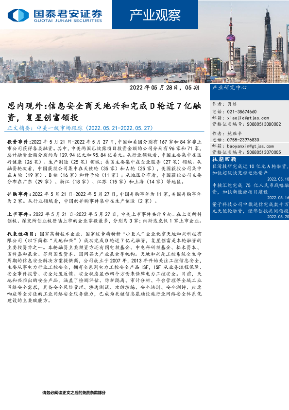 【国泰君安证券】【20220528】产业观察05期:思内观外,信息安全商天地兴和完成D轮近7亿融资,复星创富领投-29页