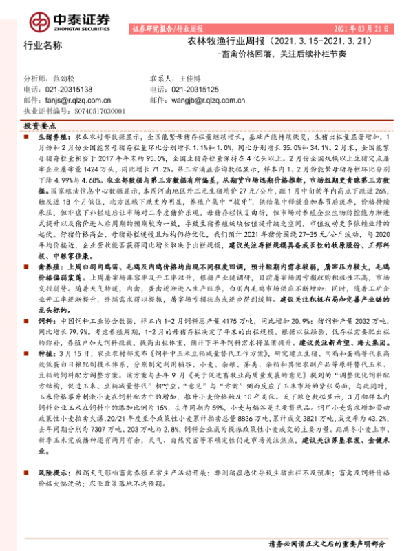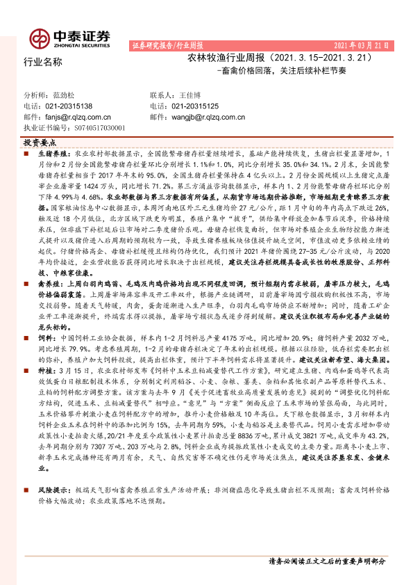 【中泰证券】【20210321】20210321-中泰证券-农林牧渔行业周报:畜禽价格回落,关注后续补栏节奏-14页