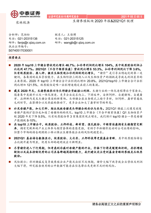 【中泰证券】【20210505】农林牧渔专题研究报告:生猪养殖板块2020年报&2021Q1梳理-9页