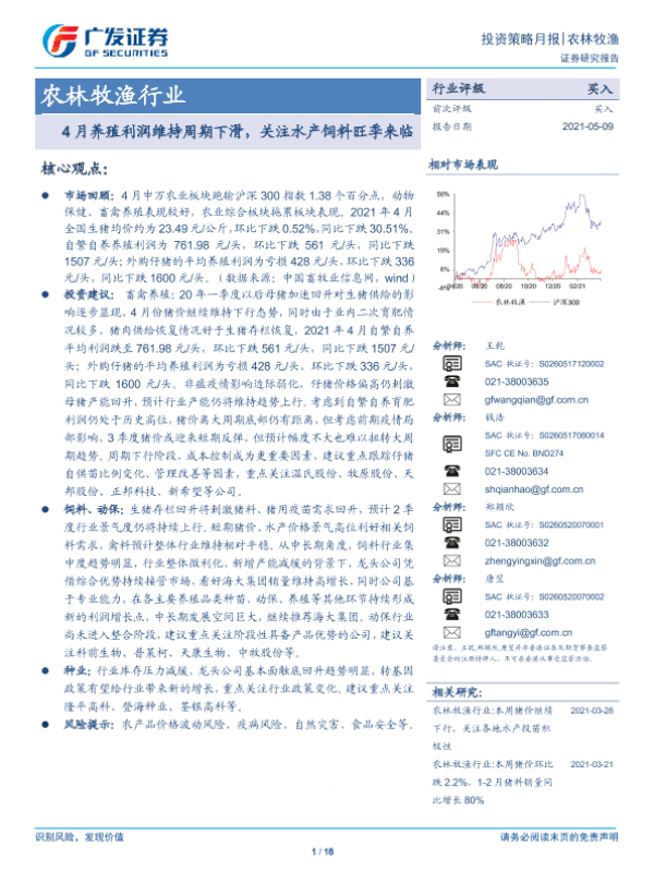 【广发证券】【20210509】20210509-广发证券-农林牧渔行业投资策略月报:4月养殖利润维持周期下滑,关注水产饲料旺季来临-18页