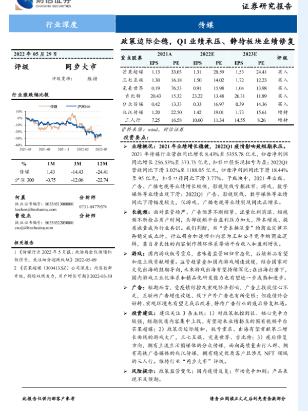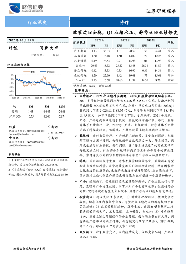 【财信证券】【20220529】传媒行业:政策边际企稳,Q1业绩承压、静待板块业绩修复-28页