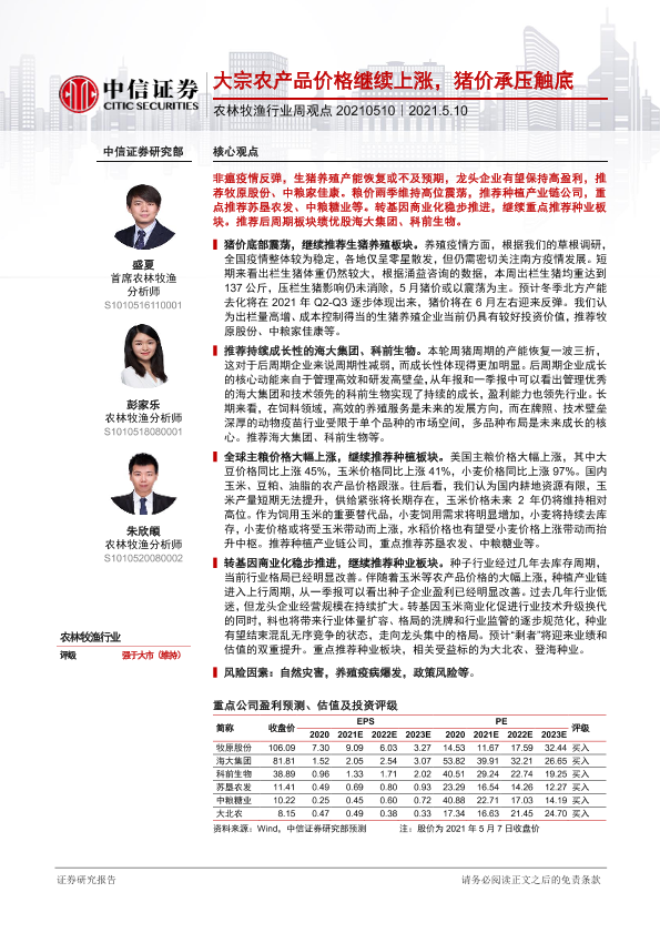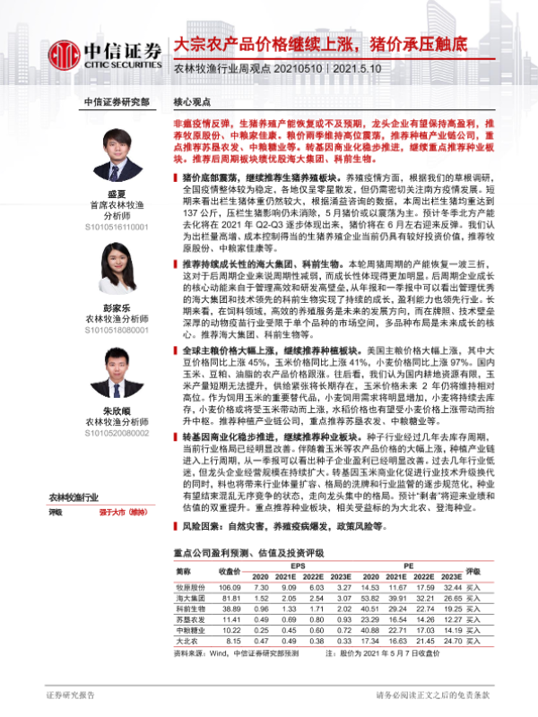 【中信证券】【20210510】农林牧渔行业周观点:大宗农产品价格继续上涨,猪价承压触底-10页