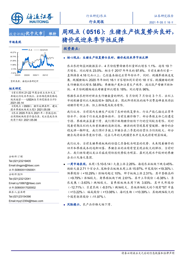【海通证券】【20210516】农业周观点:生猪生产恢复势头良好,猪价或迎来季节性反弹-4页