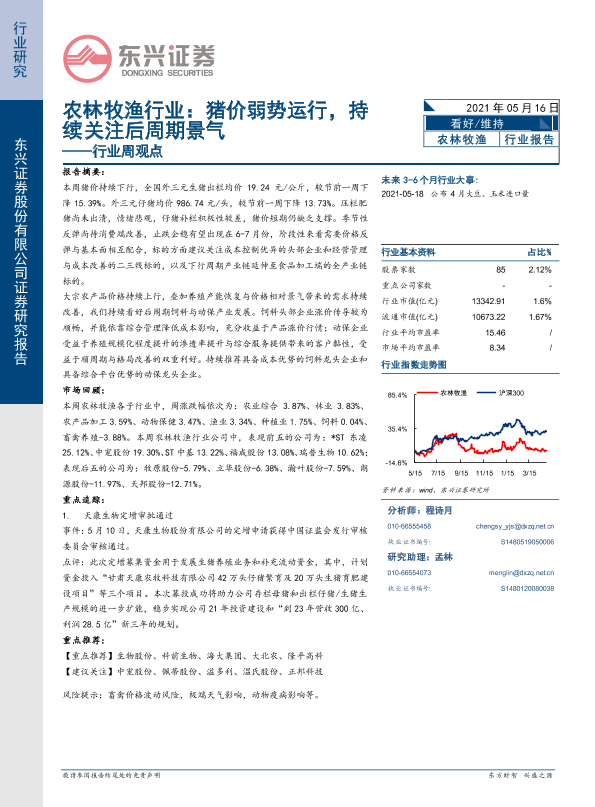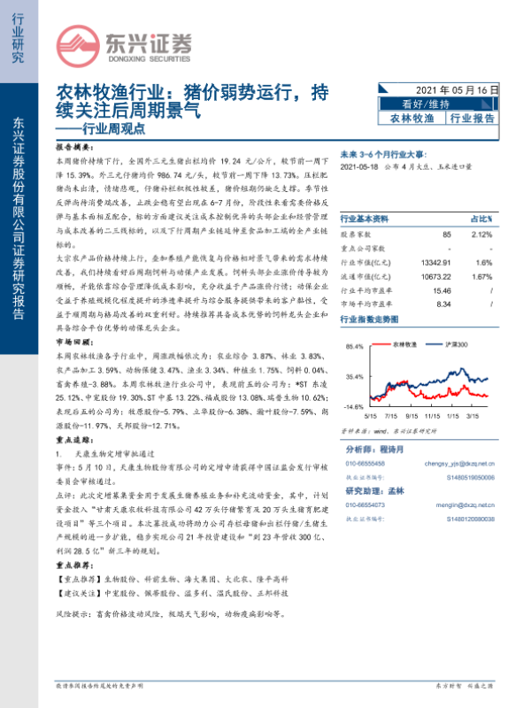 【东兴证券】【20210516】农林牧渔行业:猪价弱势运行,持续关注后周期景气-13页