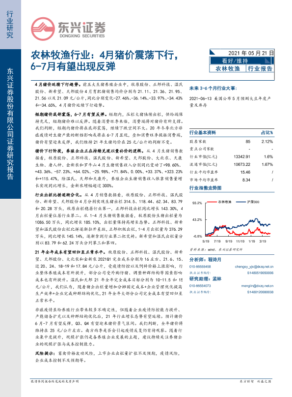 【东兴证券】【20210521】农林牧渔行业:4月猪价震荡下行,6-7月有望出现反弹-11页