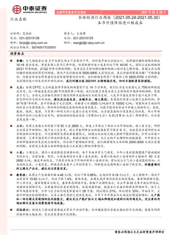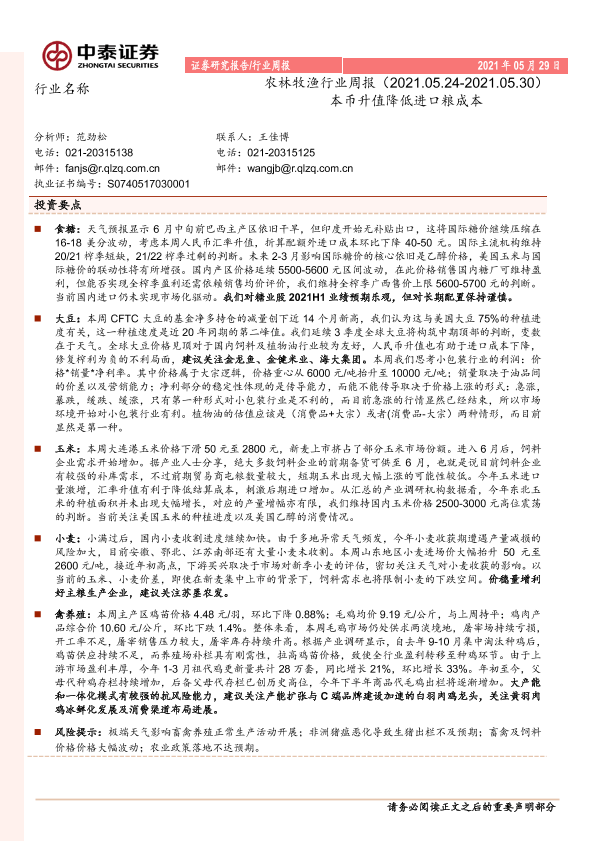 【中泰证券】【20210529】20210529-中泰证券-农林牧渔行业周报:本币升值降低进口粮成本-15页