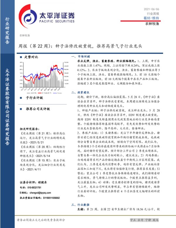 【太平洋证券】【20210606】20210606-太平洋-农林牧渔周报(第22周):种子法修改被重视,推荐高景气子行业龙头-15页