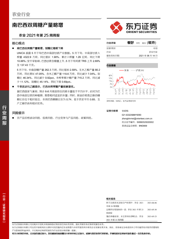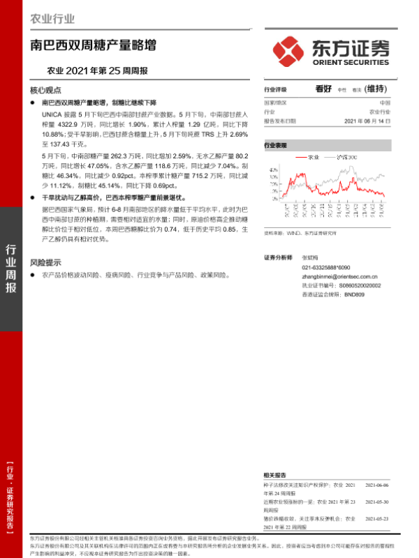【东方证券】【20210614】农业2021年第25周周报:南巴西双周糖产量略增-8页