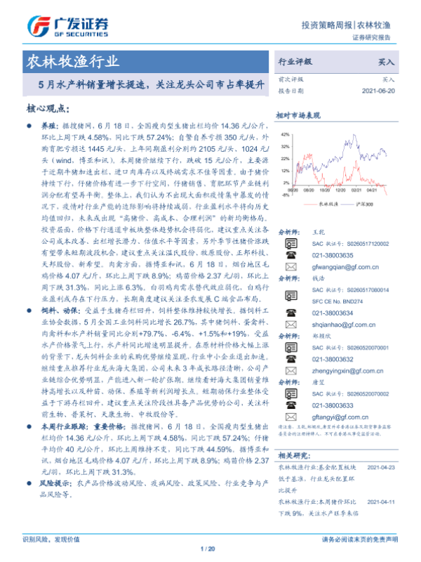 【广发证券】【20210620】20210620-广发证券-农林牧渔行业投资策略周报:5月水产料销量增长提速,关注龙头公司市占率提升-20页