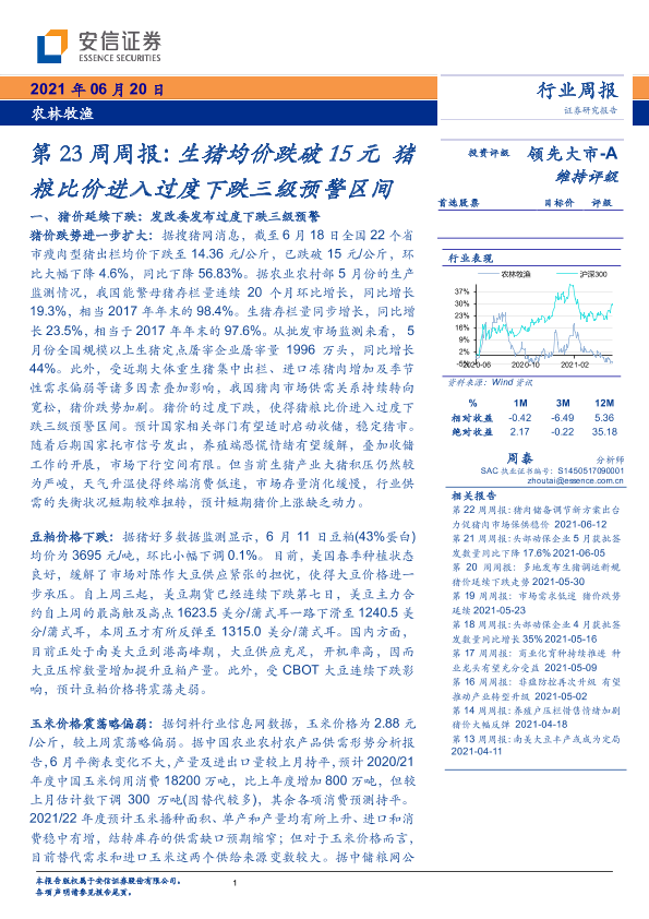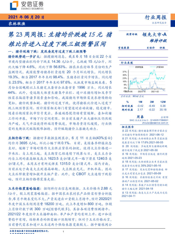 【安信证券】【20210620】农林牧渔第23周周报:生猪均价跌破15元 猪粮比价进入过度下跌三级预警区间-17页
