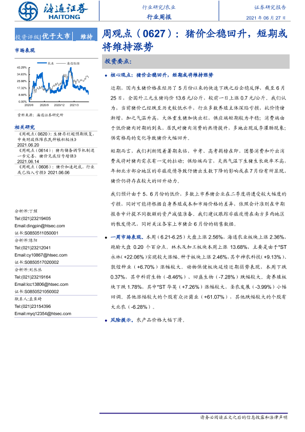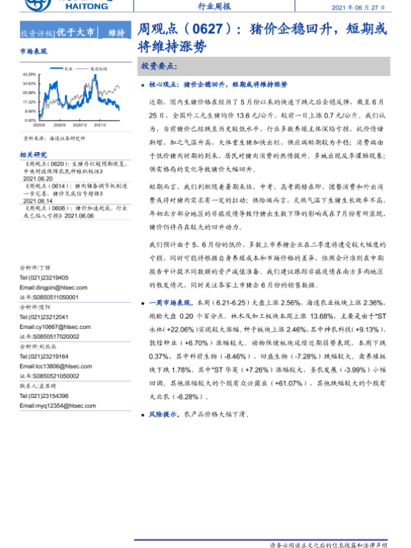 【海通证券】【20210627】20210627-海通证券-农业周观点:猪价企稳回升,短期或将维持涨势-4页