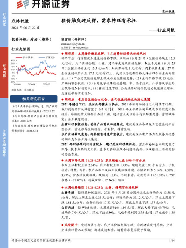 【开源证券】【20210627】农林牧渔行业周报:猪价触底迎反弹,需求转旺有承托-14页